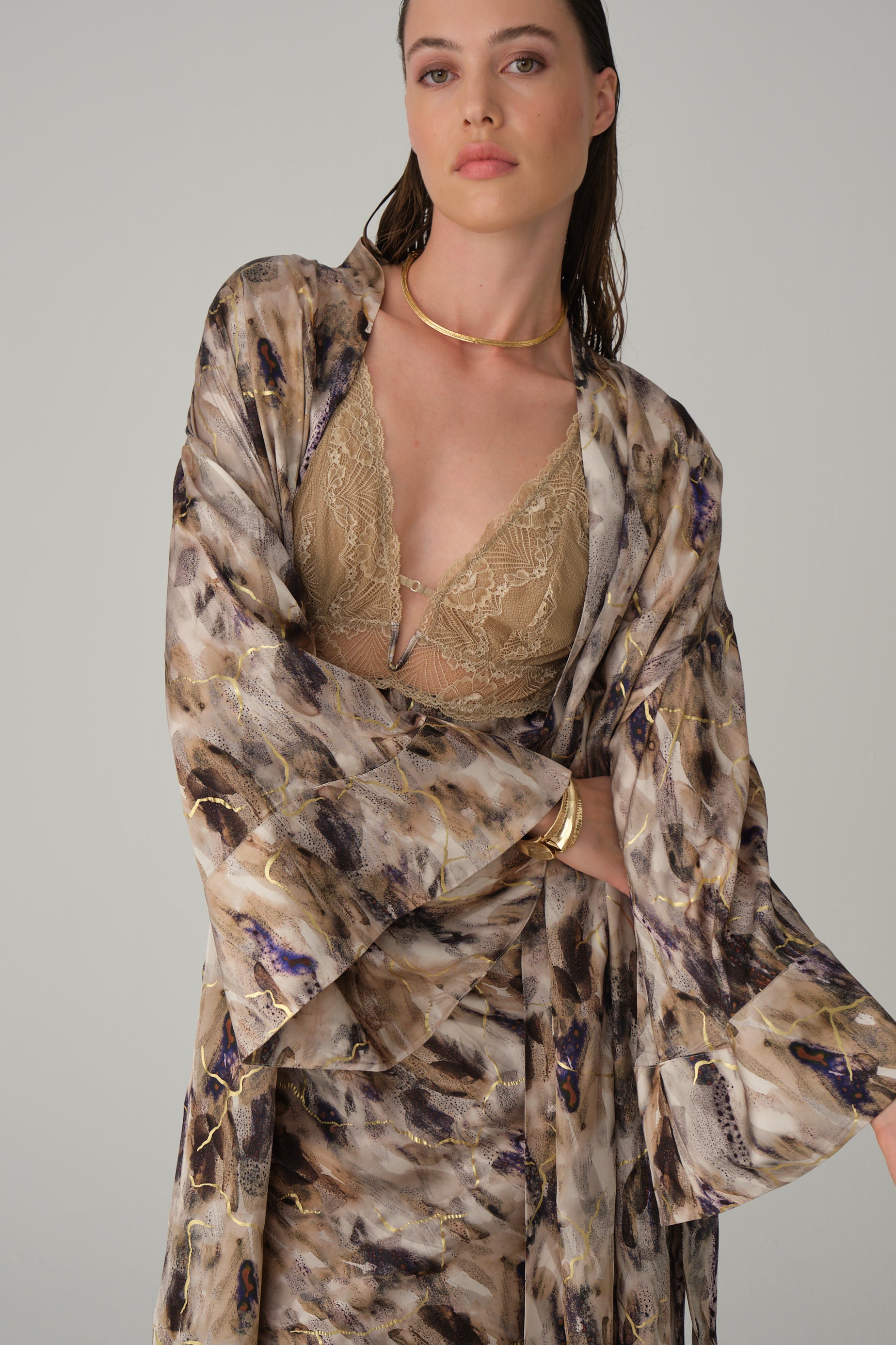 Modelin boyu 174 cm, ölçüleri ise 84 - 61 - 91 cm'dir.